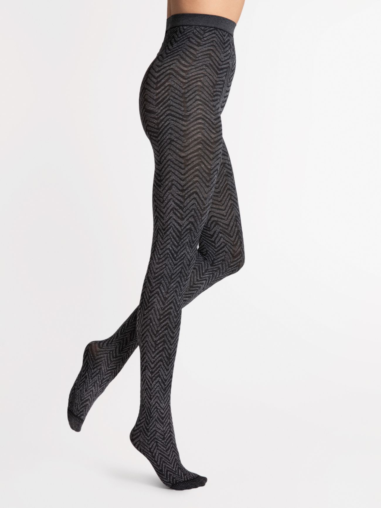 Melange tights, with a soft 3D geometric pattern. The herringbone pattern is always trendy and timeless. For the warm version of these tights (60 den), the pattern covers the whole fabric, including on the buttocks, while the toe area is reinforced.